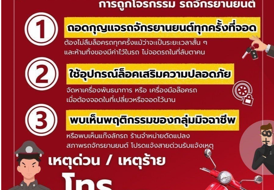 3.พบเห็นพฤติกรรมของกลุ่มมิจฉาชีพ หรือแก๊งลักรถ ร้านจำหน่าย ดัดแปลง สภาพรถจักรยานยนต์ โปรดแจ้งสายด่วนรับแจ้งเหตุ 191 ทันที