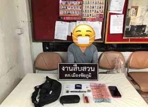 สถานที่จับกุม บริเวณข้างบ้านไม่ทราบเลขที่ ปากทางเข้าหมู่บ้านพาราไดซ์ 5 ม.5 ต.ในเมือง อ.เมือง จ.ชัยภูมิ