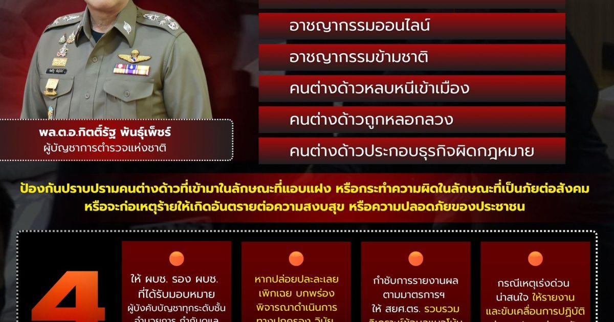 ผบ.ตร. กำชับ ตามที่ รัฐบาล และ ตร. มีนโยบายเร่งด่วนในการแก้ไขปัญหายาเสพติด ปัญหาอาชญากรรมออนไลน์ อาชญากรรมข้ามชาติ คนต่างด้าวหลบหนีเข้าเมืองโดยผิดกฎหมาย และคนต่างด้าวถูกหลอกลวงหรือประกอบธุรกิจผิดกฎหมายซึ่ง ตร. ได้มีมาตรการให้หน่วยปฏิบัติตามนัยหนังสือ ตร. ด่วนที่สุด ที่ ๐๐๐๗.๓๓/๓๑๖ ลง ๒๓ ม.ค.๖๘ ตลอดจนการป้องกันปราบปรามคนต่างด้าวที่เข้ามาในลักษณะ ที่แอบแฝงหรือกระทำความผิดในลักษณะที่เป็นภัยต่อสังคม หรือจะก่อเหตุร้ายให้เกิดอันตรายต่อความสงบสุขหรือความปลอดภัยของประชาชน หรือความมั่นคงแห่งราชอาณาจักร อันส่งผลต่อภาพลักษณ์หรือประสิทธิภาพในการบังคับใช้กฎหมายของสังคมโดยรวม จึงกำชับให้ทุกหน่วยดำเนินการ ดังนี้