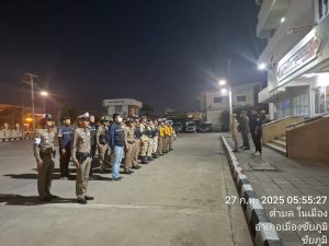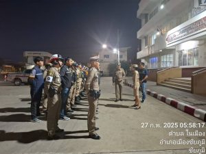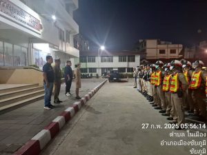 -เวลา 06.00 น. ปล่อยแถวระดมปิดล้อมตรวจค้นเป้าหมายยาเสพติด โดยมีนางสาวสุกัญญา กุลสุวรรณ์ นายอำเภอเมืองชัยภูมิ เป็นประธานในพิธี