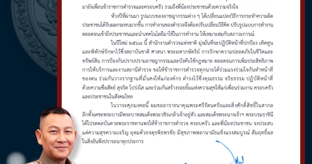 “ในวาระดิถีขึ้นปีใหม่ พุทธศักราช 2568 ผมขอส่งความสุขและความปรารถนาดีมายังเพื่อนข้าราชการตำรวจและครอบครัว รวมถึงพี่น้องประชาชนด้วยความจริงใจ