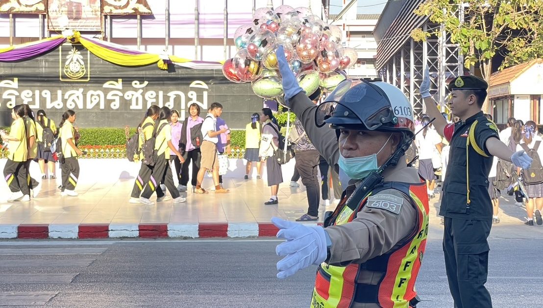 วันที่ (28ก.พ.68) เวลา 07.00น. ร.ต.ต.พิทยาคม แก้วทน (6103)รอง สว.(จร.)สภ.เมืองชัยภูมิ อำนวยความสะดวกด้านการจราจร หน้าโรงเรียนสตรีชัยภูมิ สภาพการจราจรคล่องตัว